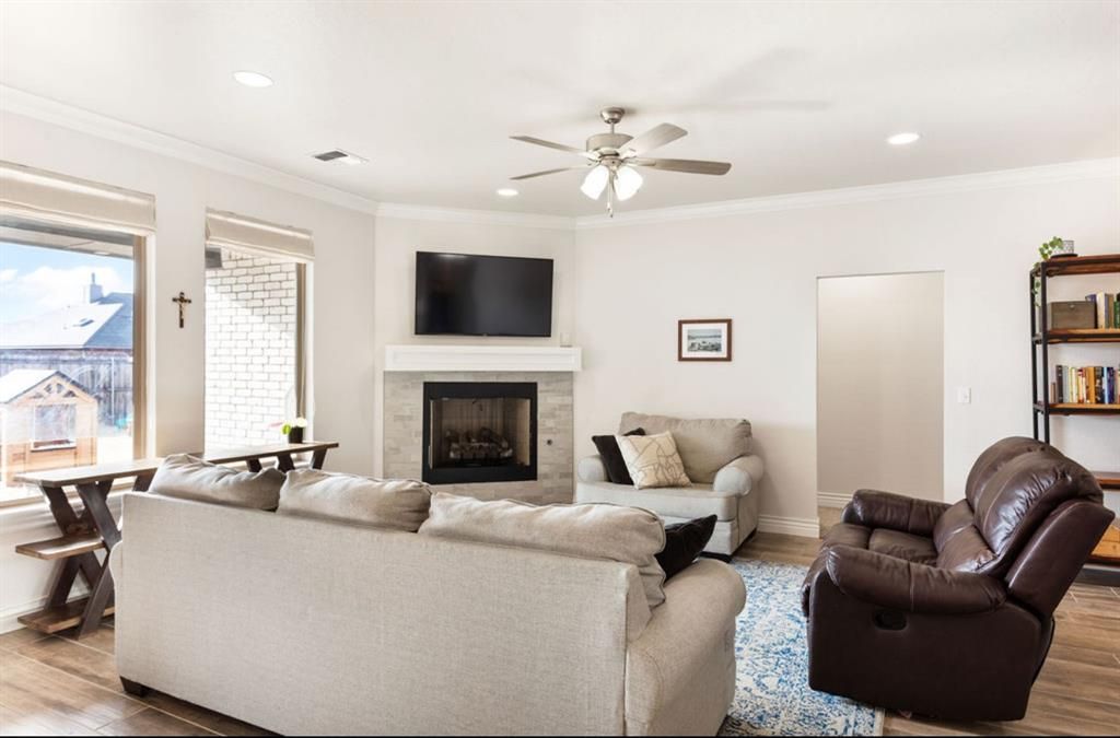 Prime location with great curb appeal. Step inside to a welcoming foyer with immediate access to a dedicated office or guest bedroom. The oversized living room offers a gas fireplace and direct access to the kitchen. The kitchen features granite countertops, a center island, beautifully built white cabinets, stainless steel appliances, a pantry, and a designated dining area. A large laundry room with additional storage. Split floor plan with a large primary bedroom, recessed ceiling, and an en-suite bathroom with a soaker tub, shower, dual-sink vanity and walk-in closet. Three guest bedrooms available with great closet space! The home includes one full guest bathroom with a shower/tub combo and an additional half bathroom.Out back, enjoy a yard maintained by a sprinkler system and fully enclosed with wood privacy fencing. Additional features include three car driveway with two car attached driveway.