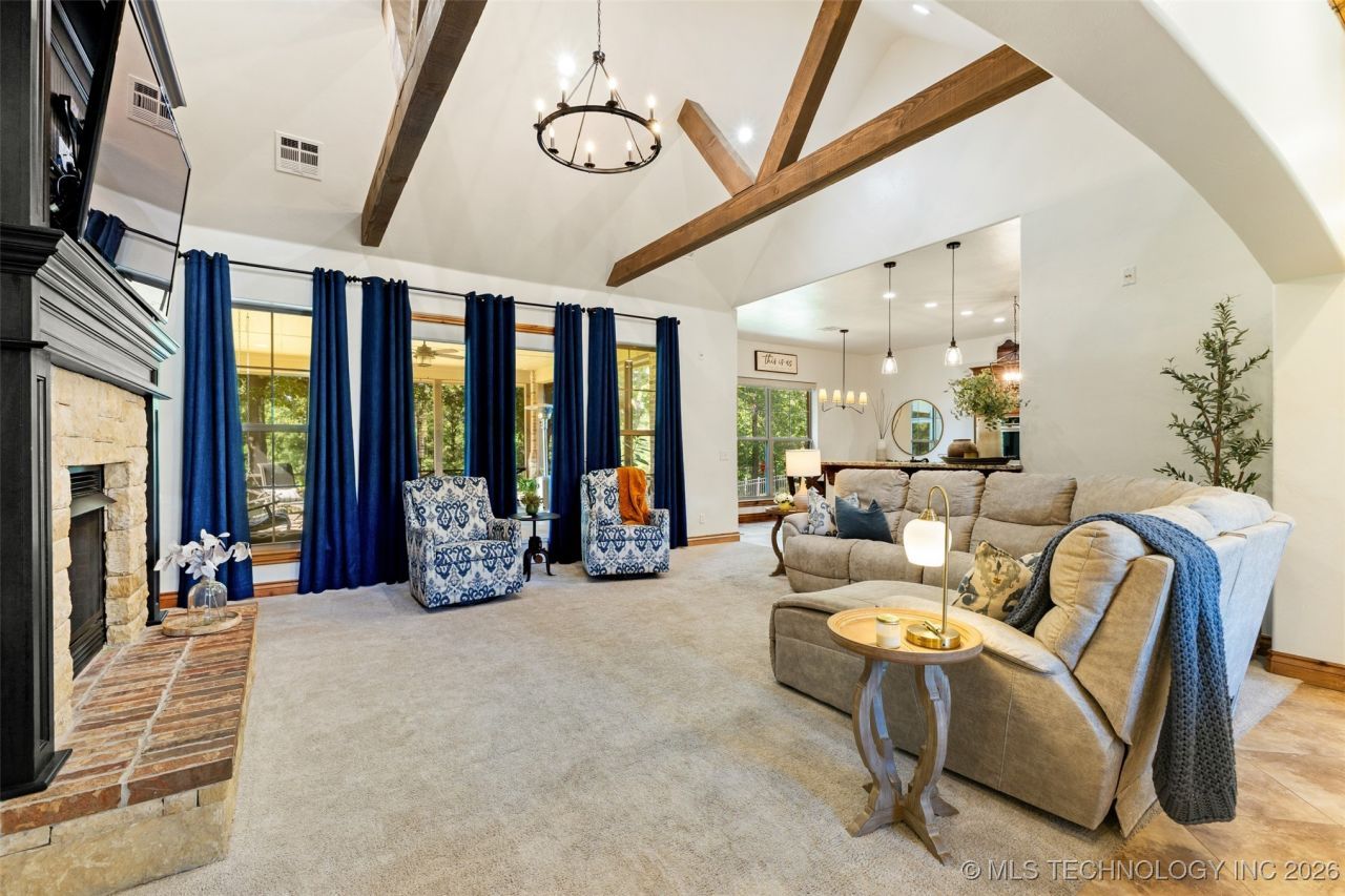 Welcome to your private estate on 2.71 acres in the prestigious Manors Addition. This thoughtfully designed residence combines everyday comfort with sophisticated entertaining spaces across a versatile split-level layout. The main level centers around an open-concept living area where wood beam ceilings and a gas fireplace create warmth and character. Move effortlessly between the formal dining room, kitchen, and breakfast nook-each space offering its own connection to the surrounding acreage. The kitchen delivers serious functionality with expansive granite countertops, a multi-station island featuring its own prep sink, and storage solutions throughout. Privacy defines the bedroom arrangement. The primary suite occupies its own wing with a spa-inspired bath and generous walk-in closet, while two additional bedrooms share a well-appointed bathroom on the opposite side of the home. A main-floor office provides dedicated workspace without sacrificing bedroom count. The upper level reveals a true bonus: a flexible suite complete with bedroom, bathroom, and bar area-perfect for guests, teens, or a secondary living quarters. Practical amenities include a three-car garage with storm cellar access, an oversized utility room with dual sinks, and storage solutions in nearly every corner. The covered rear porch extends your living space outdoors with access from three separate rooms. Outside, established landscaping frames a stocked pond, while raised garden beds and a recreational zip line offer year-round enjoyment. This is where your family creates their story-in a home that balances refined living with the freedom of space.
