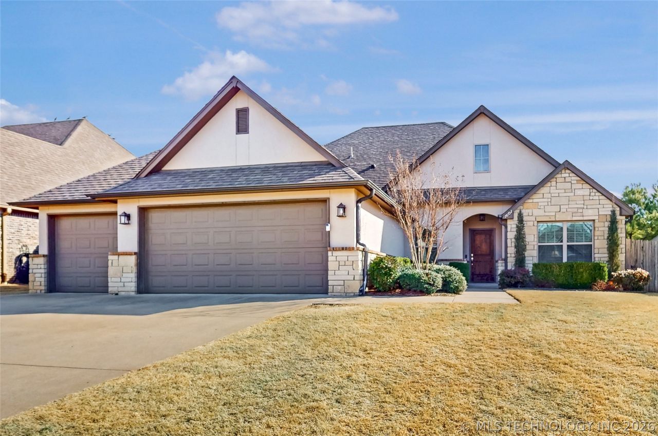Beautifully maintained 3-bedroom, 2-bath home with dedicated office (or optional 4th bedroom) and a spacious 3-car garage. This home features numerous upgrades including enhanced cabinetry and fixtures, upgraded tile in the bathrooms, and a premium gas stovetop. Stucco exterior adds timeless curb appeal, and the interior and exterior have been freshly painted for a clean, move-in-ready feel. Designed for comfort and efficiency with an allergy filtration system on the HVAC and a full sprinkler system. Located in a desirable neighborhood with a community pool and convenient access to restaurants, shopping, major highways, and the Broken Arrow school district. Seller is offering a $3,000 carpet allowance with acceptable offer.