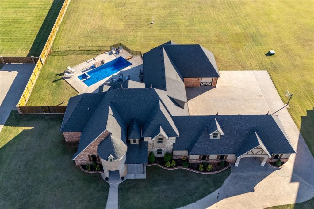 This exquisite executive home blends classic Tudor and French influences, located on 2.66 acres with 5,662 sq. ft. of living space. The property features 6 bedrooms, 5 bathrooms, a study, a game room, a music room, and a versatile flex space. An attached guest house provides a perfect multi-generational living setup, with a second living area, kitchen, two bedrooms, and one bath. The estate has a 23,000-gallon in-ground heated saltwater pool & spa, with a waterfall & stone diving board, surrounded by fencing. A 4-car garage, motor court, & circle drive are complemented by a 2,400 sq. ft. insulated shop/barn on slab w/ electricity, two overhead doors, & plumbed for a future bath. There is also a 1,200 sq. ft. lean-to for additional storage. Inside, soaring ceilings over 20 ft greet you with a stone gas log fireplace. The open floor plan is ideal for family living and entertaining. The chef's kitchen features custom knotty alder cabinets, 3 cm granite counters, stainless appliances, a built-in refrigerator & freezer, double ovens, a gas cooktop, pot filler, & hammered copper sink. The luxurious Owner's Suite offers a walk-in tile shower w/ multiple heads, a jetted soaking tub, double-sink vanity, & a spacious walk-in closet. The main floor has an additional bedroom and bath, while two more bedrooms and baths are upstairs. A custom wrought iron stair railing and Juliet balcony add elegance to the main living area. The attached guest quarters feature a 2nd stone gas fireplace, full kitchen, 2 bedrooms and 1 bath w/ a private entrance, direct access to the pool & backyard. The home is equipped w/3 CH&A units, providing 8 zones of temperature control. Additional features include a hidden Safe Room, security system, water softener, and much more. Located on 2 tracts, in the desirable Weatherford, Oklahoma area, across from an 18-hole golf course & large city park, this property presents a rare and exceptional opportunity to own a luxury home in a prime location.