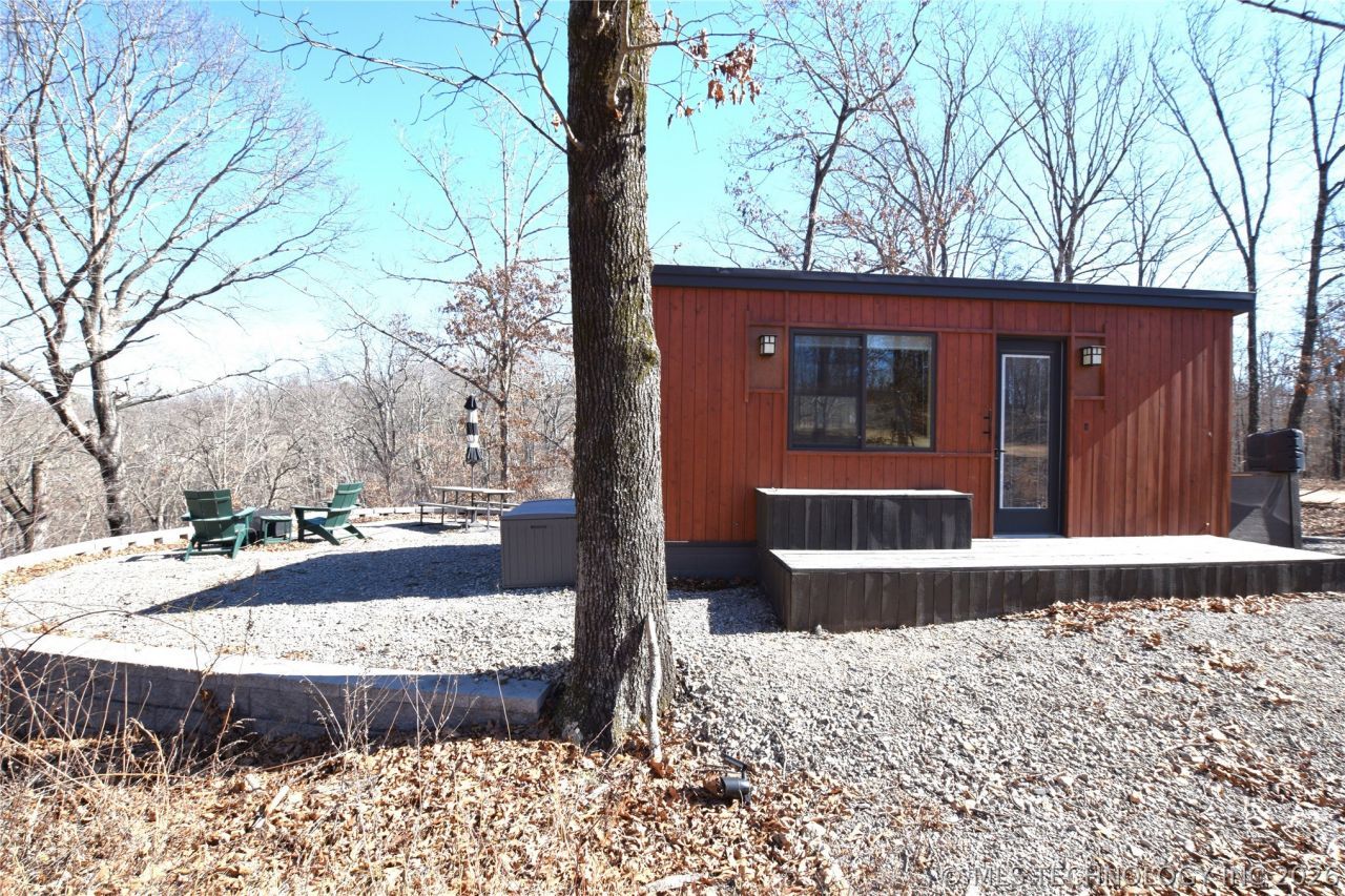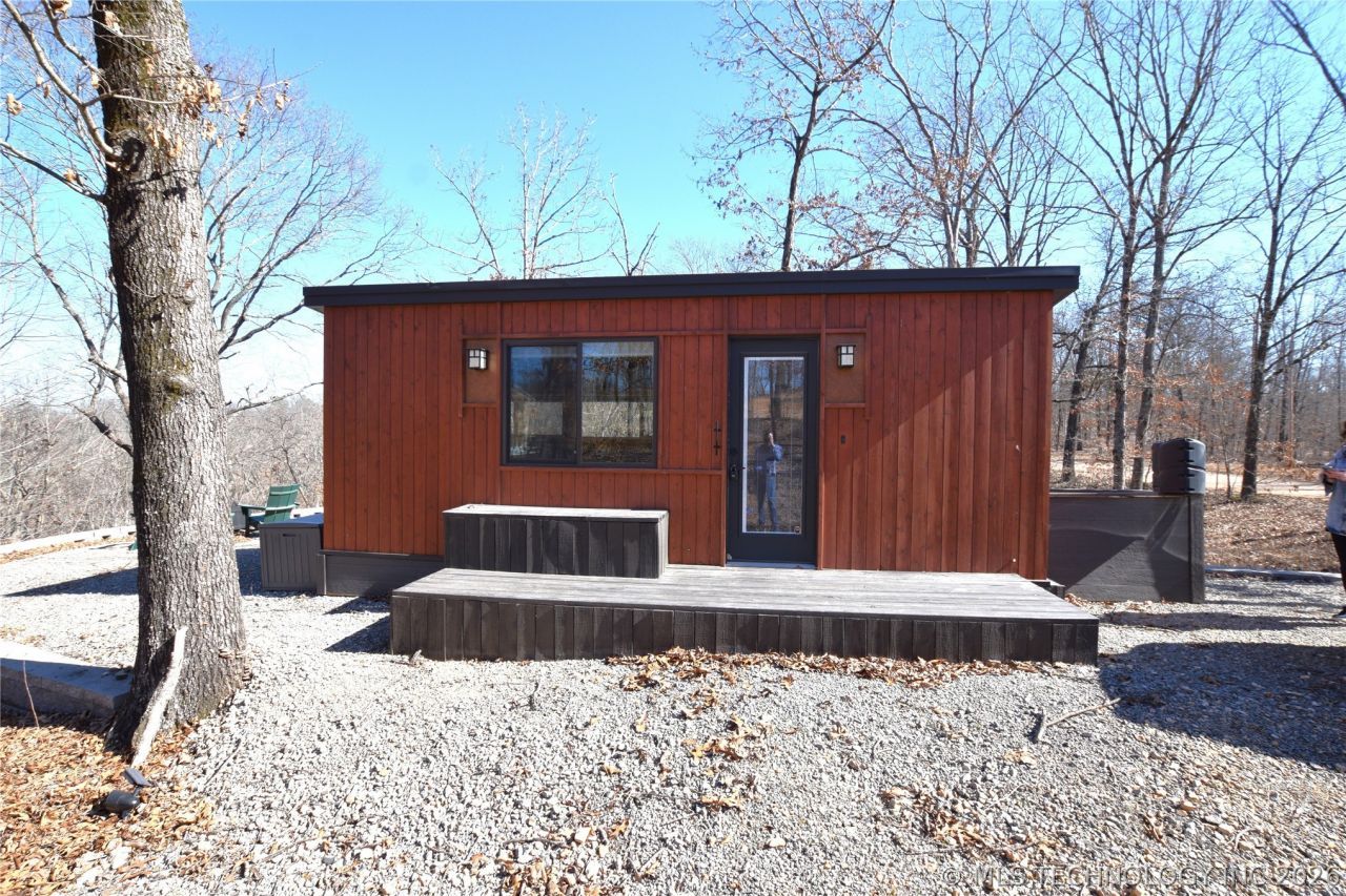 Are you ready for your getaway destination? This newer tiny home, built in 2022, offers 220 sq ft (per CH) of thoughtfully designed living space and sits on 2.8 acres m/l. The home is connected to septic and rural water, making it move-in or rental ready. Located within 1 mile of the Illinois River Ranch, this property is perfectly positioned for outdoor recreation and relaxation. A concrete block retaining wall surrounds the home, and the large gravel patio at the rear features a fire pit where you can take in the stunning mountain views. Inside, you'll find an open floor plan combining the dining, living, kitchen, and bedroom space along with a private bath, mini-split heating and cooling, cozy pine wood accents, and furnishings that convey-making this a turnkey setup. OzarksGo internet is available, and the quiet setting offers excellent hunting and privacy. Whether you're looking for a personal escape or a profitable VRBO investment, this cozy retreat checks all the boxes.