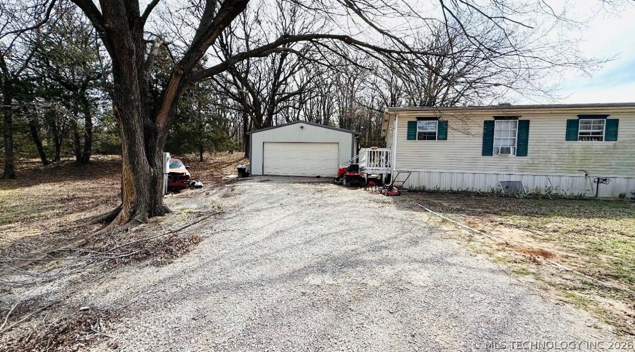 This modular home sits on a beautiful lot with lots of mature trees and good shade. Its amenities includes a concrete patio on the back with a storm shelter, a handicap ramp to the 2 car detached garage, a wood deck on the front, backyard that to opens to nature and a retaining wall. This spacious home has an open floorplan including a large living/dining area and spacious kitchen with lots of cabinets. The master suite has a large closet, roof 6 years old. Water heater 2-3 years old. HVAC 7 years old. Needs TLC. Sold As Is