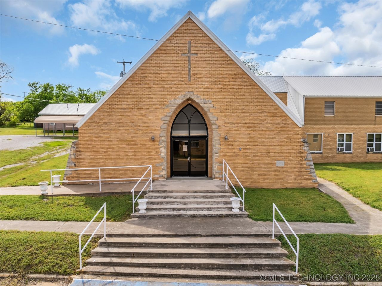 Beautiful historic church, set up for your needs! The sanctuary has a pulpit, a piano station, a choir section, a prayer room, and a mix/movie/music room. The baptistry is behind the pulpit/choir area. The church itself has 7,067 sf and includes numerous (approx 18) classrooms, offices, or libraries. Half of the rooms are downstairs and half of the rooms are upstairs. Numerous bathrooms. The breezeway leads to the 5,000 sq ft building with the large kitchen area/fellowship area that also has a basketball court. Bathrooms are located in this area as well. The spacious kitchen is equipped for cooking and has numerous items such as many cabinets and a free-standing ice machine. A roll-up window with counter top area is between the kitchen and the fellowship/eating area. A large classroom/area is set upstairs and it overlooks the basketball area. The parking lot serves both of these buildings and includes a handicap ramp. Additional storage building. This property sits on a corner lot and is 0.84 acres. The parking lot can be accessed from Franklin St. This is a unique property with many possibilities.