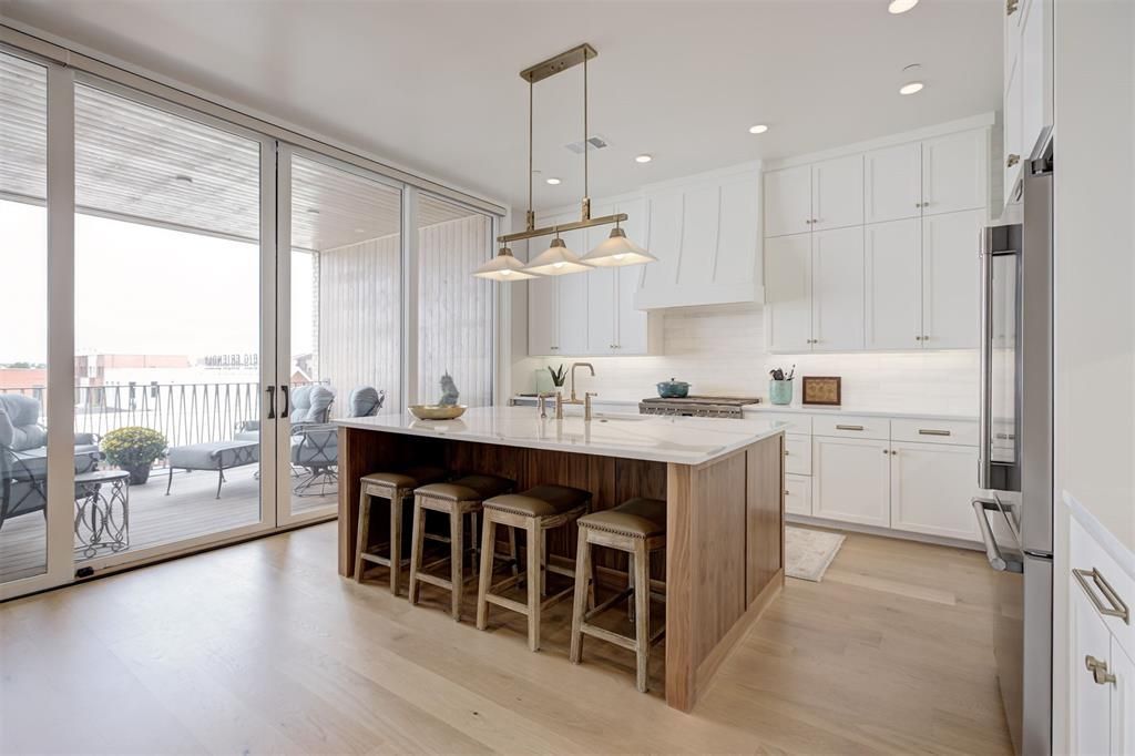 This custom-designed top-floor flat offers three bedrooms, including two primary suites, and abundant storage, setting a new standard for modern living in Wheeler District. The curated layout maximizes space and functionality, blending sophistication with comfort. Expansive windows flood the home with natural light and frame unobstructed views, while hardwood floors and geothermal heating and cooling add both style and sustainability. The chef's kitchen features a quartz island, upgraded appliances, and seamless flow into the living and dining areas. From here, step out to a large covered veranda with glass openings, an inviting space for morning coffee, evening meals, or simply taking in the view of Wheeler District and Downtown Oklahoma City. Elevator access and an oversized private garage provide ease and convenience, while the prime location keeps you steps from Wheeler District's pool, park, retail, and dining. Perfect for someone seeking the ease of one-level living in Wheeler District and the convenience of a true lock and leave lifestyle, this home combines thoughtful design with a vibrant community setting.